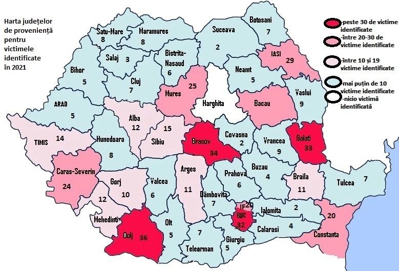 Principalele județe de proveniență pentru victimele traficului de persoane identificate în 2021 au fost Dolj, Brașov, Galați, București, Iași și Bacău, județe care deja putem spune că sunt în mod tradițional sursă a traficului de persoane. Destinațiile principale pentru victimele traficul de persoane originare din România rămân Italia, Germania, Spania și Marea Britanie. Ponderea victimelor exploatate intern rămâne una crescută, fiind identificate 322 de victime exploatate
