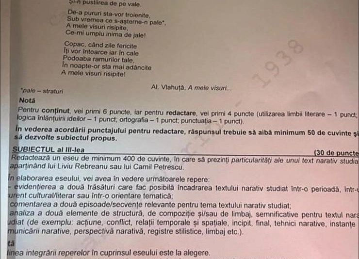 La Subiectul al III-lea elevii de la Real au avut de făcut un eseu despre particularitățiile unui text narativ studiat aparținând lui Liviu Rebreanu sau lui Camil Petrescu.