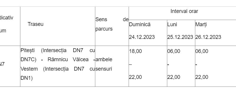 Potrivit prevederilor Ordinului MT-MAI numărul 1249-132/2018, circulaţia vehiculelor rutiere cu masa totală maximă autorizată mai mare de 7,5 tone altele decât cele destinate exclusiv transportului de persoane, este interzisă în zilele duminică 24 decembrie, luni 25 decembrie și marți 26 decembrie (prima și a doua zi de Crăciun și ziua premergătoare) 2023.