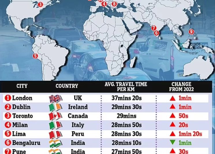 Podiumul este completat de Toronto, cu o medie de 29 de minute pentru 10 kilometri. Următoarele orașe care sunt un adevărat coșmar pentru șoferi sunt: Milano (Italia), Lima (peru), Bengaluru (India), Pune (India), București (România), Manila (Filipine) și Bruxelles (Belgia)